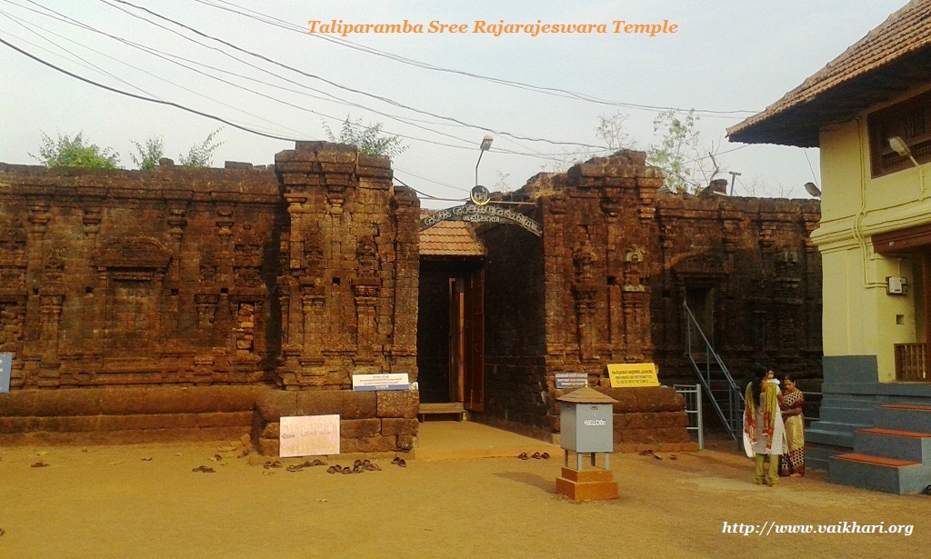 The famous Sree Rajarajeswara temple is situated in Kannur district, 2 kms North of Taliparamba town. Lord Siva here, is known in different names such as SADASIVA, PERINCHELLOORAPPA, LAKSHMEEPURESA, RAJADHIRAJA etc. In venerable prayer, though it seems to be pertaining to Siva, the method of worship is distinct in many ways. Ages before, the deity was consecrated by the great sage, Agasthya Muni on a Wednesday. Hence ‘darsan’ on Wednesday is considered very auspicious even today. In ‘Threda Yuga’ Lord Sreeramachandra paid obeisance to Lord Siva on the Namaskara Mandapam. Hence entry to the mandapam is restricted. To fill pots made of gold silver and copper with ghee and dedicate them to Lord are the main offerings here. They are called ‘Ponninkudam’, ‘Vellikudam’ and ‘Neyyamruthu’ respectively. ‘Pattam’, Wedlock for goddess Sree Parvathi and Pushpanjali are the other important offerings. Only ghee is used inside the Sanctum Sanctorum. Women are allowed to enter inside the temple only after the ‘ATTAZHA PUJA’. Children below 4 years are not allowed to enter inside. There is no well inside the temple.